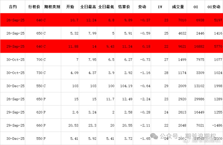 (1)腾讯:9月最大持仓范围500-620,窝轮牛熊街货分布590-705,今收642.5,上涨0.08%,期权盘路变化超过1000张的仓位如下,红色是增仓较大的仓位,分别是9月26日到期的周期权640购,还有9月的月期权640购,分别增仓5000多张。总体来说,市场对腾讯仍然是看涨,偏乐观。