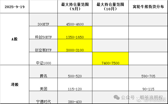 下图是今天大A的3个ETF和一个指数,以及港股的腾讯、美团和宁德时代的最大持仓量范围以及窝轮牛熊分布范围,也就是9月和10月的资金筹码分布,黄色的表示跟上个交易日有变动。