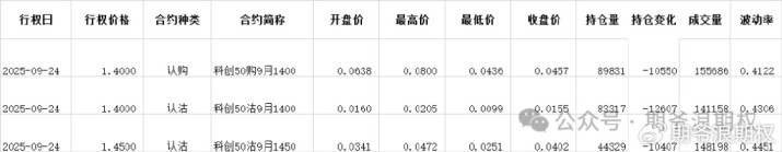 (2)科创50ETF:9月最大持仓范围1350-1650,今收1.431,下跌1.31%,期权9月主力合约,支撑位下移1档到1350。认购认沽都全是减仓:认购减仓集中在1300-1650,合计4.2W张;认沽减仓集中在1200-1500,合计4.4W张。今天变化超过1W张的仓位如下图: